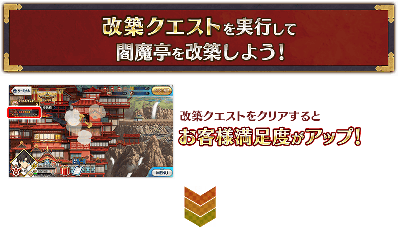このクエストを実行することで『閻魔亭』の施設が改築され、お客様満足度がアップしていきます。お客様満足度は奉納ポイントの獲得量に影響しており、改築を進めるほど多くの奉納ポイントを獲得できるようになります。
