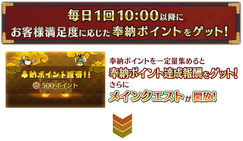 メインクエスト第三節クリア後、1月5日(日)以降の10:00~翌9:59までの間にイベントマップに遷移した際、お客様満足度と同じ値の奉納ポイントを獲得できます。