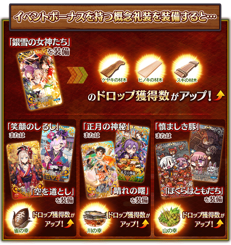 また、聖晶石召喚にてピックアップされる期間限定概念礼装「★5(SSR)笑顔のしるし」「★5(SSR)空を道とし」「★4(SR)正月の神秘」「★4(SR)晴れの曙」「★3(R)慎ましき豚」「★3(R)ぼくらはともだち」を装備することで、イベントアイテム「雀の幸」「川の幸」「山の幸」それぞれのドロップ獲得数がアップします。
