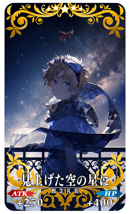 イベントアイテム交換で入手できるイベント限定概念礼装「★5(SSR)見上げた空の星に」を装備することで、イベントクエストにおける自身の攻撃の威力がアップします。
