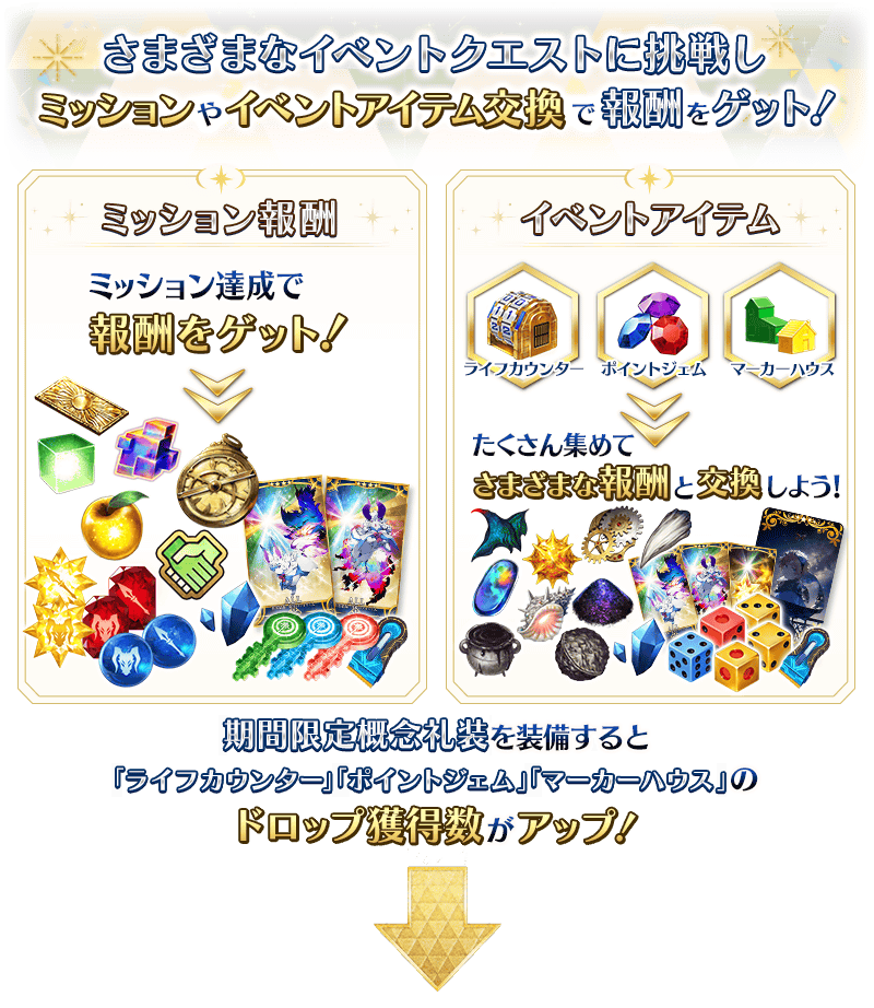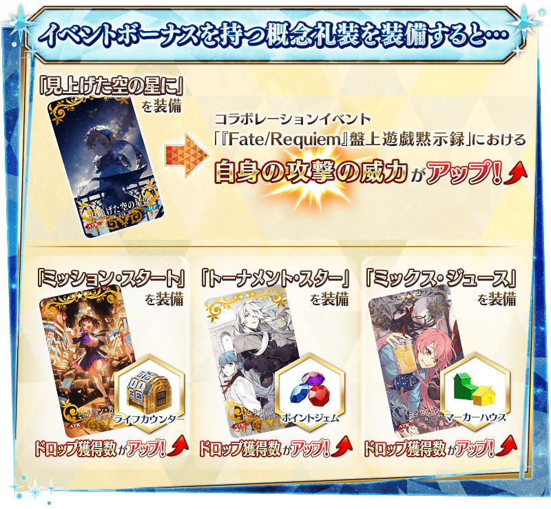 また、聖晶石召喚にてピックアップされる期間限定概念礼装「★5(SSR)ミッション・スタート」「★4(SR)トーナメント・スター」「★3(R)ミックス・ジュース」を装備することで、イベントアイテム「ライフカウンター」「ポイントジェム」「マーカーハウス」それぞれのドロップ獲得数がアップします。