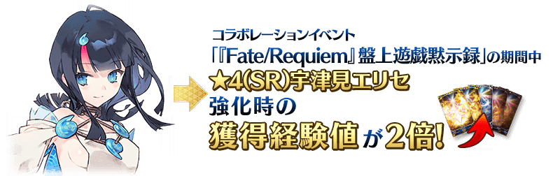 本イベントの期間中は、「★4(SR)宇津見エリセ」を強化した際の獲得経験値が2倍になります。