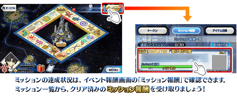 ※クリア条件を満たしただけでは、報酬は獲得できませんのでご注意ください。 ※ミッション報酬を受け取らないと、新たなミッションが開放されないことがありますのでご注意ください。