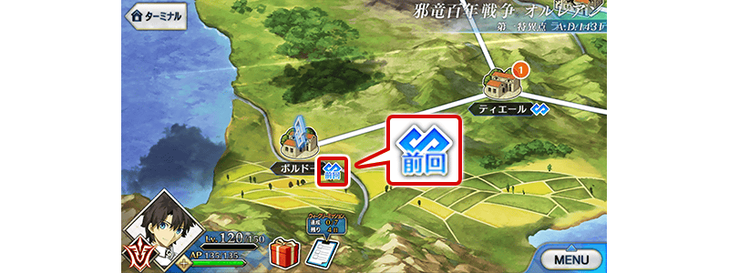 フリークエストのあるスポットに表示しているマークの下に、前回実行したクエストが分かるように「前回」という表示を追加いたしました。