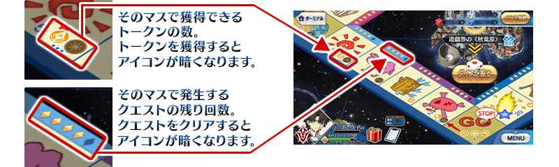 ガッポリーのマス目には、残りのクエスト回数や獲得できる「トークン」が表示されています。
