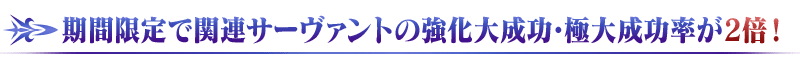 下記の期間中、「Fate/Requiem×Fate/Grand Orderコラボレーションイベント」関連サーヴァントの強化をおこなった際に、大成功(経験値2倍ボーナス)・極大成功(経験値3倍ボーナス)の発生率が期間限定で2倍になります!