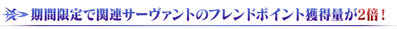 下記の期間中、クエスト開始時のサポート選択画面にて、サポートに他のマスターの対象サーヴァントを選択した場合と、他のマスターが自身の対象サーヴァントをサポートに選択した場合、フレンドポイントの獲得量が2倍になります。