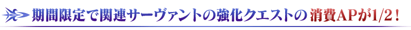 下記の期間中、「Fate/Requiem×Fate/Grand Orderコラボレーションイベント」関連サーヴァントの強化クエストの消費AP量が1/2になります!(バトルにおいて撤退した場合でも、同様の消費量になります)