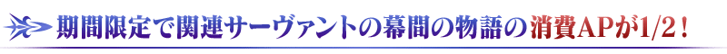 下記の期間中、「Fate/Requiem×Fate/Grand Orderコラボレーションイベント」関連サーヴァントの幕間の物語の消費AP量が1/2になります!(バトルにおいて撤退した場合でも、同様の消費量になります)