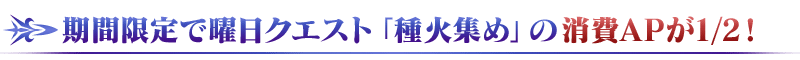 期間限定で、カルデアゲート内に曜日ごとに出現するクエスト「種火集め」の消費AP量が1/2になります!(バトルにおいて撤退した場合でも、同様の消費量になります)