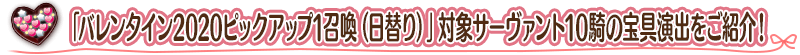 「バレンタイン2020ピックアップ1召喚(日替り)」ピックアップ対象サーヴァント10騎の宝具演出を紹介いたします!