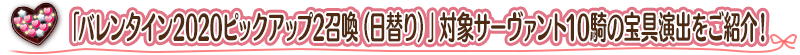 「バレンタイン2020ピックアップ2召喚(日替り)」ピックアップ対象サーヴァント10騎の宝具演出を紹介いたします!