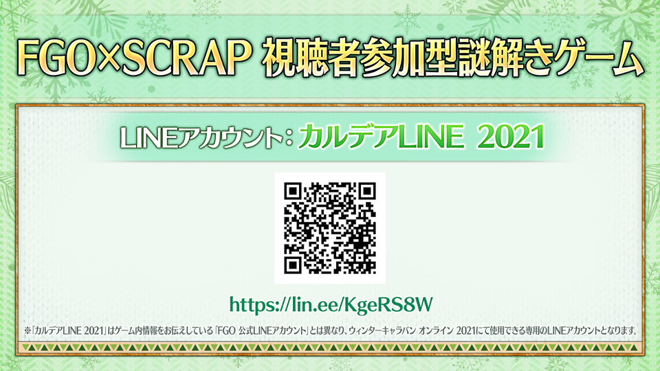 ②「FGOウィンターキャラバン オンライン 2021」Vol.1~Vol.3の各配信番組の「視聴者参加型謎解きゲーム」内にて出題された問題の「最終回答」をLINEアカウント「カルデアLINE2021」に入力する。