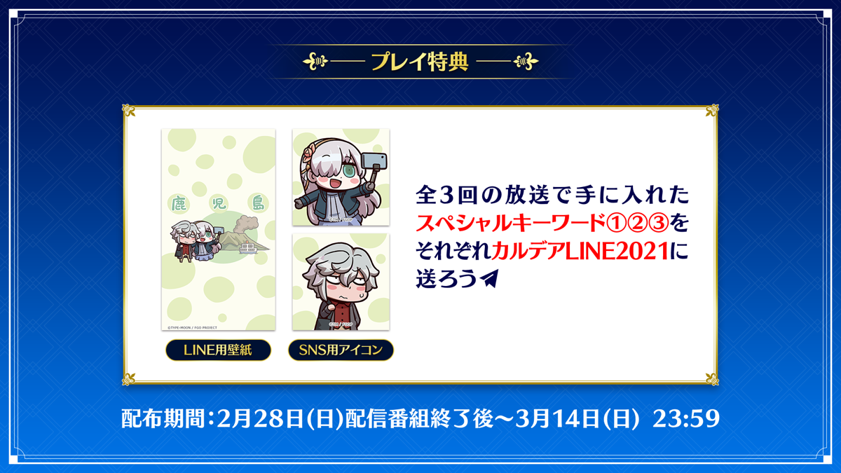 「FGOウィンターキャラバン オンライン 2021」Vol.1~Vol.3内の視聴者参加型謎解きゲームコーナーにて出題された問題の最終回答をLINEアカウント「カルデアLINE2021」に入力し、「スペシャルキーワード」を手に入れて入力すると、リヨさんが描いたご当地イラストを使用したSNS用アイコン・LINE用壁紙をプレゼントいたします。