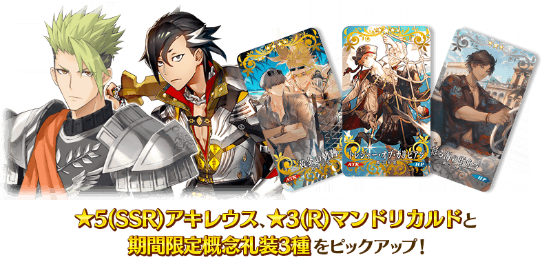 ※「★5(SSR)アキレウス」「★3(R)マンドリカルド」「★2(UC)エドワード・ティーチ」の霊衣開放権は、期間限定イベント「カルデア・サマーアドベンチャー! ~夢追う少年と夢見る少女~」のイベントアイテム交換期間のみ入手可能です。