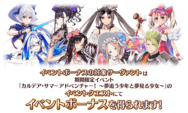 期間限定イベント「カルデア・サマーアドベンチャー! ~夢追う少年と夢見る少女~」の期間中、下表のサーヴァントはイベントクエストにおいて、イベントボーナスを得られます!