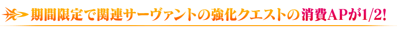 下記の期間中、期間限定イベント「カルデア・サマーアドベンチャー! ~夢追う少年と夢見る少女~」関連サーヴァントの強化クエストにおける消費APが1/2になります!(バトルにおいて撤退した場合でも、同様の消費量になります)