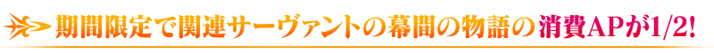 下記の期間中、期間限定イベント「カルデア・サマーアドベンチャー! ~夢追う少年と夢見る少女~」関連サーヴァントの幕間の物語の消費APが1/2になります!(バトルにおいて撤退した場合でも、同様の消費量になります)