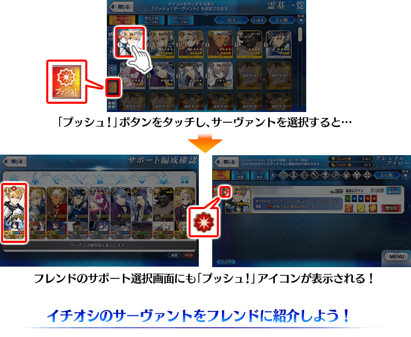 フレンドやフォローに対して自分のイチオシサーヴァントを示すことができる『プッシュ!サーヴァント』機能を追加いたしました。