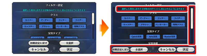 サーヴァント選択画面などのフィルター設定において、説明テキストの表示領域や一部ボタンの表示位置を調整し、スクロールできる領域がより広くなるように改修いたしました。