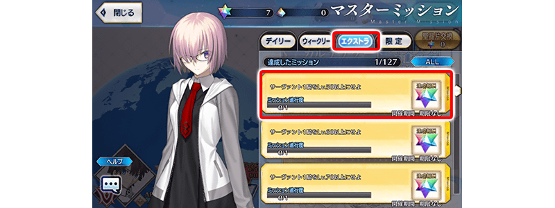 ※過去に霊基変還(売却)などをおこなって現在は所持していないサーヴァントが条件を満たしていた場合でもミッションの進行度にカウントされます。 ※仮加入状態のサーヴァントが条件を満たした場合でもミッションの進行度にカウントされます。 ※同一のサーヴァント2騎目のLv.はミッションの進行度にカウントされませんのでご注意ください。