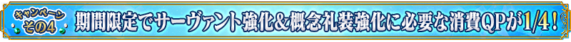下記の期間中、サーヴァントおよび概念礼装を強化する際に必要なQPの消費量が、期間限定で1/4になります!