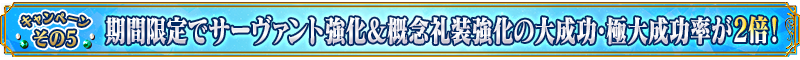 下記の期間中、サーヴァントおよび概念礼装の強化をおこなった際に、大成功(経験値2倍ボーナス)・極大成功(経験値3倍ボーナス)の発生率が期間限定で2倍になります!