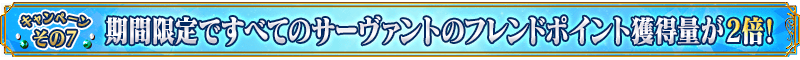 下記の期間中、クエスト開始時のサポート選択画面にて、サポートに他のマスターのサーヴァントを選択した場合と、他のマスターが自身のサーヴァントをサポートに選択した場合、フレンドポイントの獲得量が2倍になります。この機会にフレンドポイントをたくさん入手しましょう!