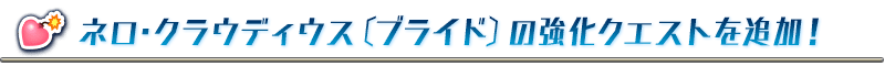 「★5(SSR)ネロ・クラウディウス〔ブライド〕」が強化される特別なクエスト「サーヴァント強化クエスト」が、カルデアゲートに恒常的に追加されます。