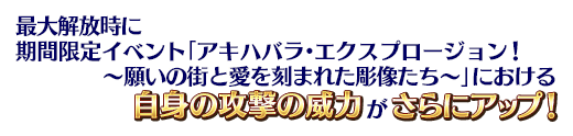 ※下記の概念礼装の期間限定イベント「アキハバラ・エクスプロージョン! ~願いの街と愛を刻まれた彫像たち~」における「自身の攻撃の威力がアップ」の効果は、各レアリティ以下のサーヴァントが装備時のみ発動されます。