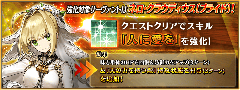 「★5(SSR)ネロ・クラウディウス〔ブライド〕」が強化される特別なクエスト「サーヴァント強化クエスト」が、カルデアゲートに恒常的に追加されます。