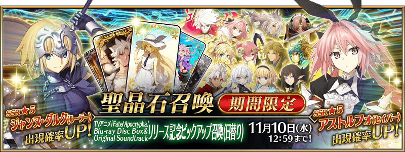 その他にも、期間限定『TVアニメ「Fate/Apocrypha」Blu-ray Disc Box&Original Soundtrackリリース記念ピックアップ召喚(日替り)』を同時開催!