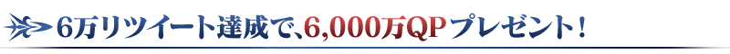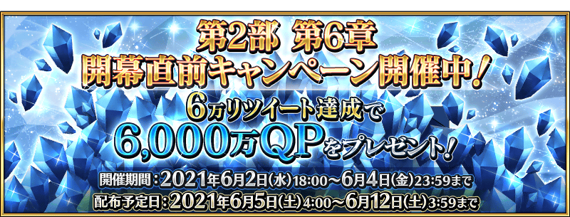 公式ツイッターの上部に固定表示されている「第2部 第6章開幕直前!合計聖晶石60個獲得可能!」ツイートのリツイート数が、下記の期間内で6万リツイートを達成すると、2021年6月5日(土) 3:59までに「特異点F 炎上汚染都市 冬木」をクリアしているマスターに6,000万QPをプレゼント!