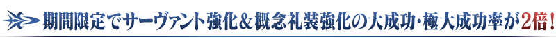 下記の期間中、サーヴァントおよび概念礼装の強化をおこなった際に、大成功(経験値2倍ボーナス)・極大成功(経験値3倍ボーナス)の発生率が期間限定で2倍になります!