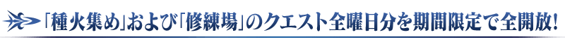 ※期間限定で出現している「種火集め」および「修練場」は通常の曜日ごとに出現している「種火集め」および「修練場」のクエストとは異なるため、「クエスト情報」は引き継がれませんのでご注意ください。