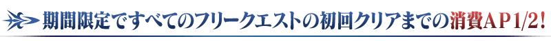 下記の期間中、メインストーリー第2部 第5.5章「地獄界曼荼羅 平安京 轟雷一閃」をクリアしていると、すべてのフリークエスト初回クリアまでの消費APが1/2になります!(バトルにおいて撤退した場合でも、クエストを初回クリア前であれば同様の消費量になります)