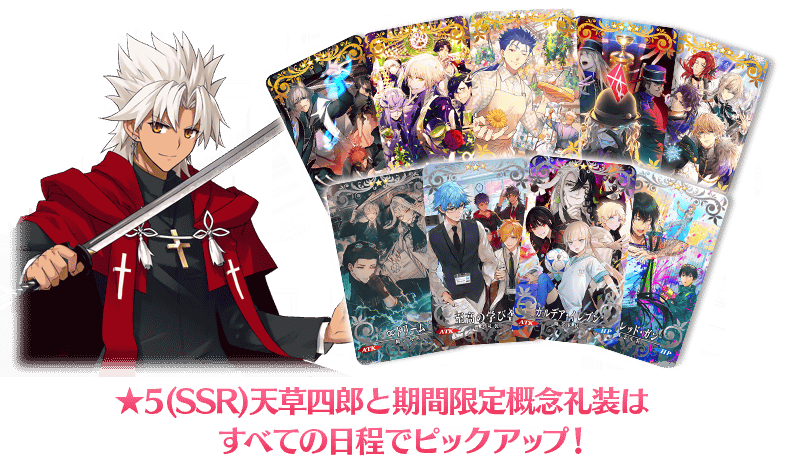 ※「★5(SSR)天草四郎」の霊衣開放権は、期間限定イベント「聖杯怪盗天草四郎 ~スラップスティック・ミュージアム~」のイベントアイテム交換期間のみ入手可能です。