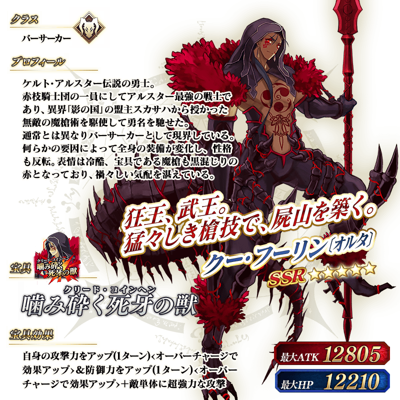 ※上記の「★5(SSR)クー・フーリン〔オルタ〕」のイラストは霊基再臨第2段階のものです。