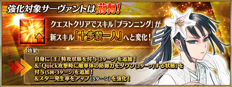 本召喚でピックアップされている「★5(SSR)天草四郎」「★3(R)荊軻」が強化される特別なクエスト「サーヴァント強化クエスト」が、カルデアゲートに恒常的に追加されます。