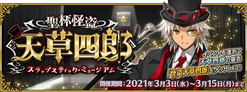 期間限定イベント「聖杯怪盗天草四郎 ~スラップスティック・ミュージアム~」の報酬として、「★5(SSR)天草四郎」の霊衣開放権が登場!