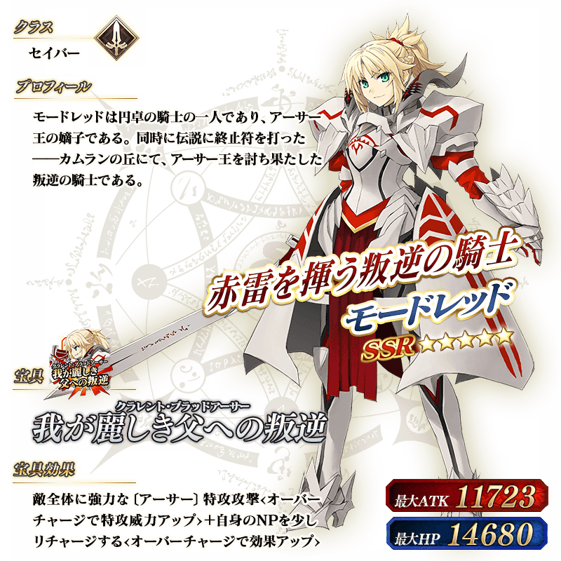 ※上記の「★5(SSR)モードレッド(セイバー)」のイラストは霊基再臨第2段階のものです。