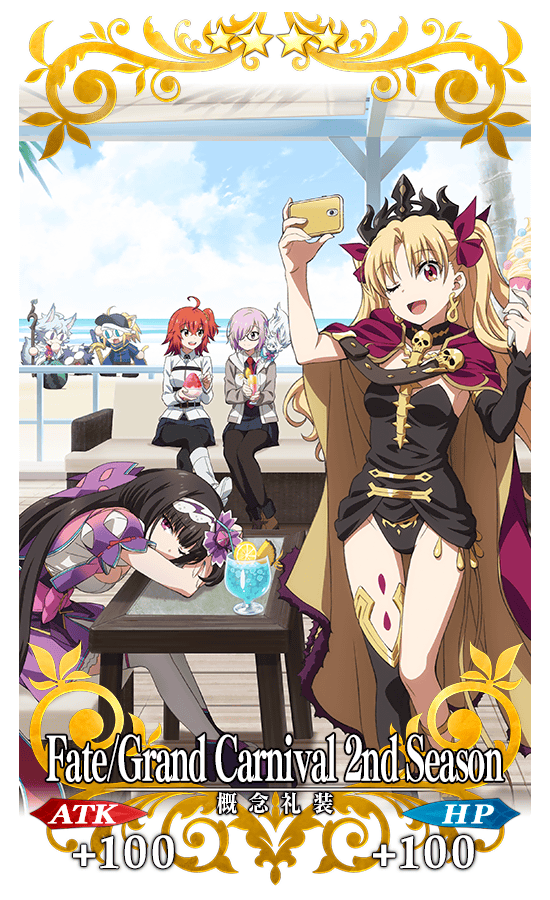 カルデアゲートにて、下記の期間中に出現する『「Fate/Grand Carnival 2nd Season」Blu-ray&DVD発売記念クエスト』をクリアして、クエスト限定の概念礼装「★4(SR)Fate/Grand Carnival 2nd Season」をゲットしましょう!