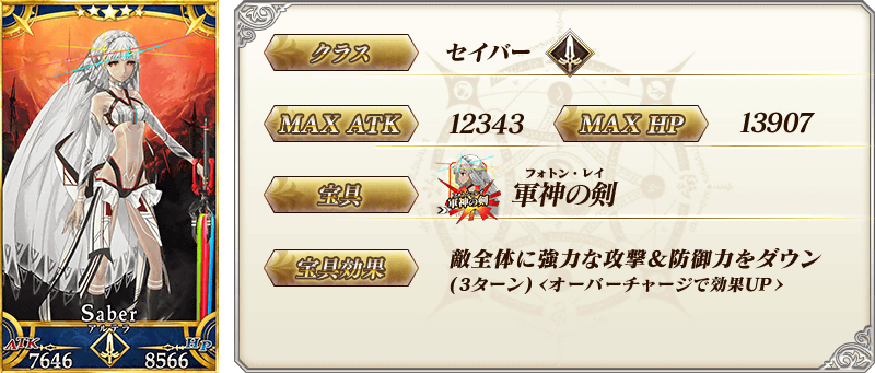 ※上記の「★5(SSR)アルテラ(セイバー)」のセイントグラフは霊基再臨第2段階のものです。