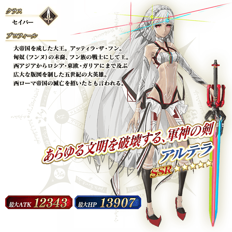 ※上記の「★5(SSR)アルテラ(セイバー)」のイラストは霊基再臨第2段階のものです。