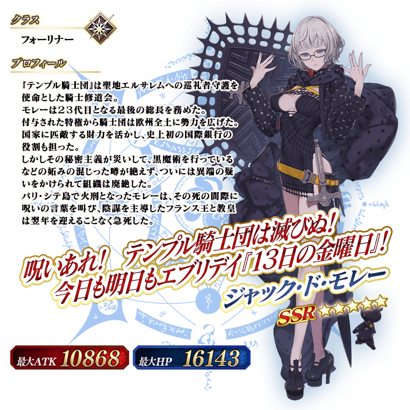 ※上記の「★5(SSR)ジャック・ド・モレー」のセイントグラフは霊基再臨第2段階のものです。