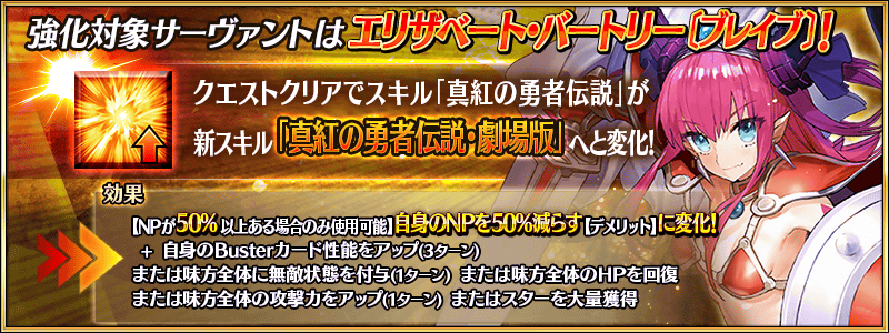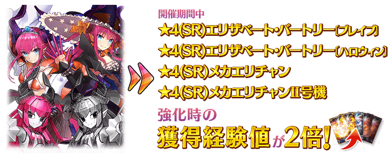 下記の期間中、「★4(SR)エリザベート・バートリー〔ブレイブ〕」「★4(SR)エリザベート・バートリー〔ハロウィン〕」「★4(SR)メカエリチャン」「★4(SR)メカエリチャンⅡ号機」を強化した際の獲得経験値が2倍になります。