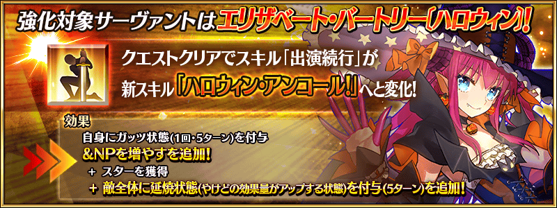 下記の期間中、「チェイテ・ハロウィン・トリロジー ウルトラデラックス総集編!」関連サーヴァントの強化クエストにおける消費APが1/2になります!(バトルにおいて撤退した場合でも、同様の消費量になります)