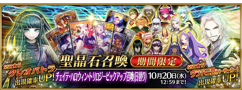 下記の期間中、「チェイテ・ハロウィン・トリロジー ウルトラデラックス総集編!」関連サーヴァントの強化をおこなった際に、大成功(経験値2倍ボーナス)・極大成功(経験値3倍ボーナス)の発生率が期間限定で2倍になります!