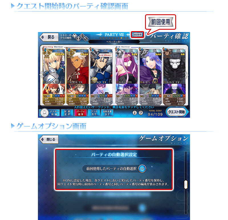 クエストごとに前回使用したパーティ番号を保持し、次回クエスト開始時のパーティ確認画面において前回使用したパーティに「前回使用」マークを表示するように改修いたしました。 ※保持されるのはパーティ番号のみで、パーティの内容は保持されません。 ※前回使用の情報が保持されるクエスト数には上限があり、上限を超えた場合古い前回使用の情報から削除されます。