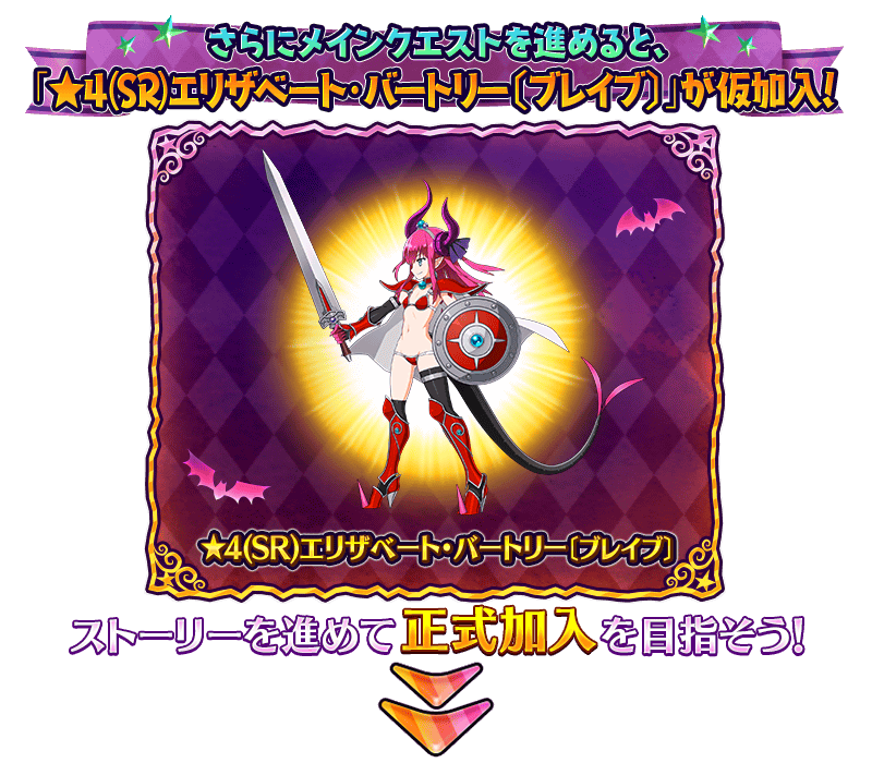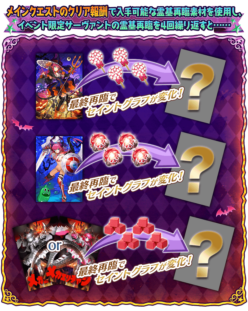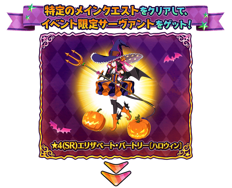 またメインクエストを進めることでイベント限定サーヴァント「★4(SR)エリザベート・バートリー〔ハロウィン〕」と「★4(SR)エリザベート・バートリー〔ブレイブ〕」が正式加入するほか、特定のメインクエストクリア後に開放される『【どちらかのみ!】「メカエリチャン」獲得クエスト』か『【どちらかのみ!】「メカエリチャンⅡ号機」獲得クエスト』をクリアすることでイベント限定サーヴァント「★4(SR)メカエリチャン」「★4(SR)メカエリチャンⅡ号機」のいずれか1騎を獲得することができます。